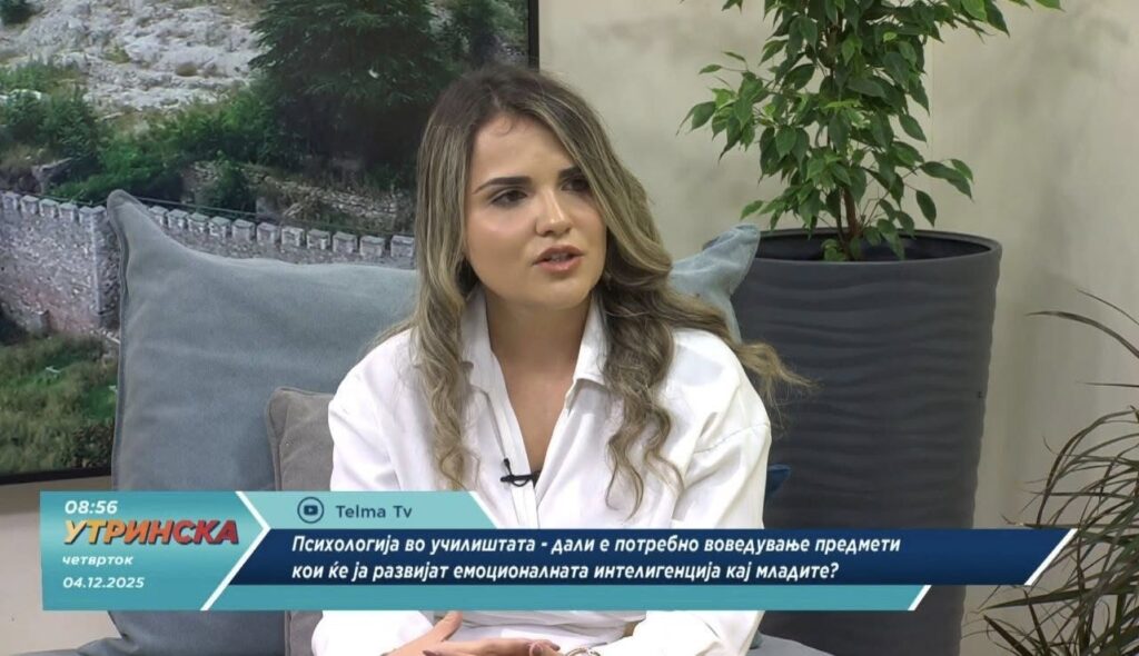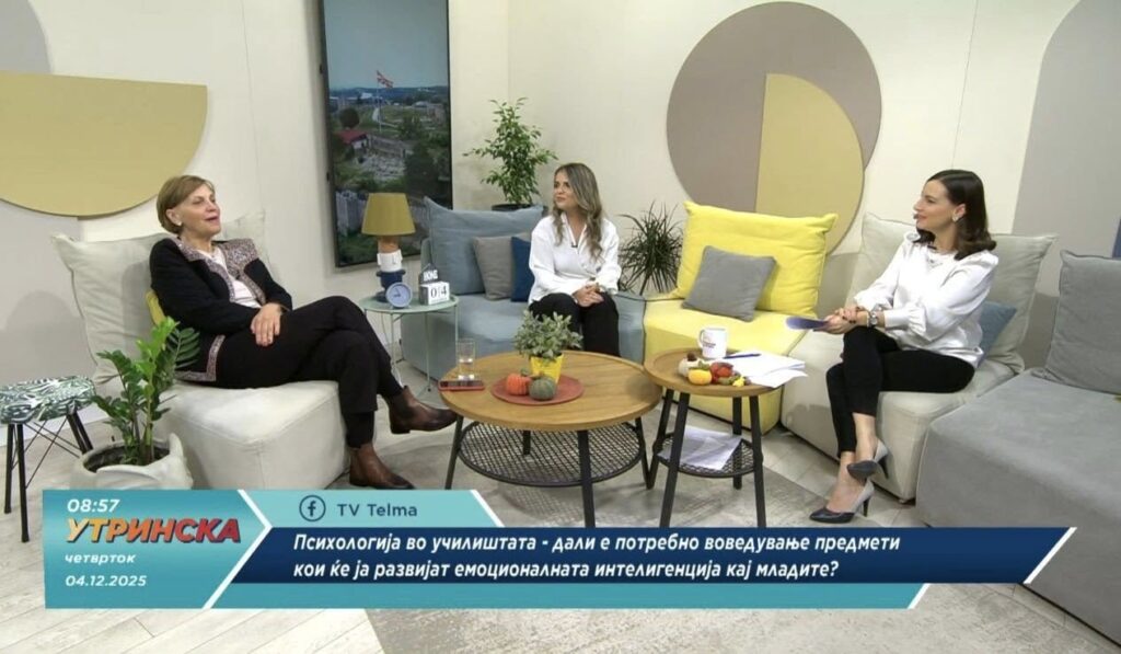 Во рамките на „Денови на психологија“- националната платформа на психолози при Комората на психолози на Р.Македонија, кои годинава се одржуваат од 01. 12. 2025 до 10. 12. 2025, под наслов „Ментално здравје на деца и млади –градење на здрава иднина“ , проф. д-р Драгана Батиќ и студентката Михаела Менчова гостуваа на телевизија Телма каде што зборуваа на тема „Едукација на децата и младите за важноста на менталното здравје “
