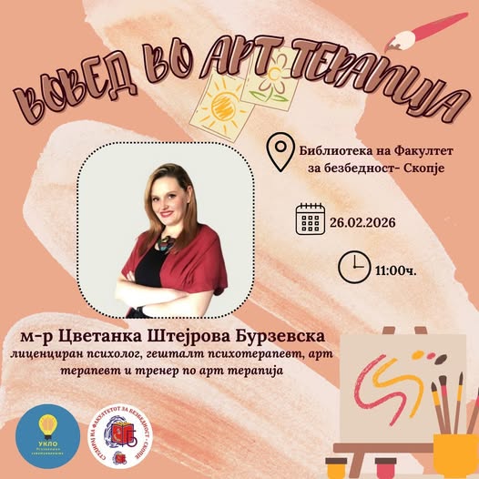 На 26.02.2026 (четврток), со почеток во 11:00 часот, во Библиотеката на Факултет за безбедност – Скопје ќе се одржи едукативна работилница во организација на Психолошко советувалиште УКЛО и проф. д-р. Драгана Батиќ на тема „Вовед во арт терапија“, со говорник м-р. Цветанка Штејрова Бурзевска, лиценциран психолог, гешталт психотерапевт, арт терапевт и тренер по арт терапија.