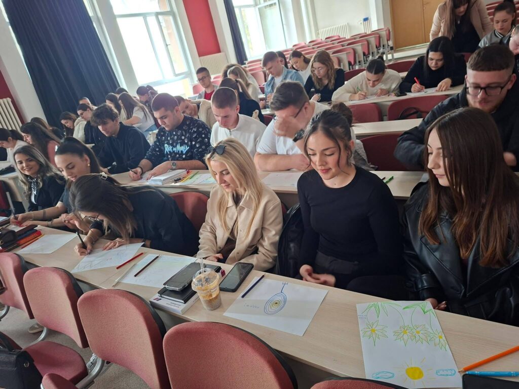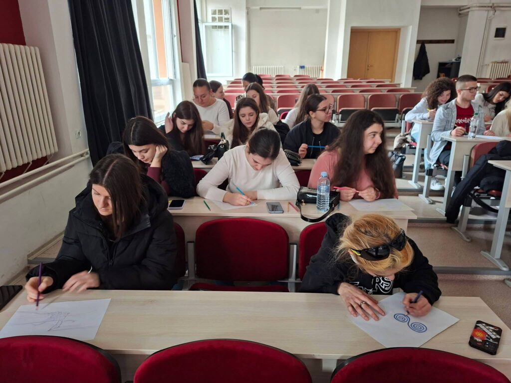 По работилницата, студентите ги споделуваа своите доживувања и добија одредени инструкции поврзни со креативниот процес преку цртање и колаж кои можат да ги користат во секојдневниот живот.